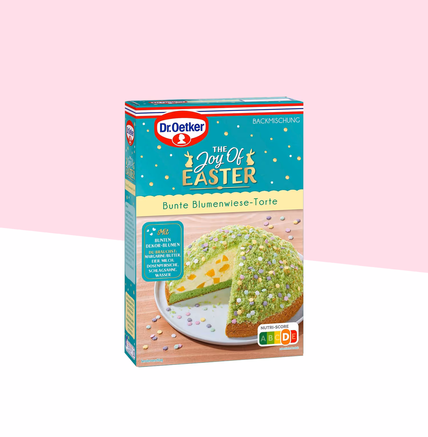 Diese Backmischung ermöglicht es, eine cremige Torte im Look einer farbenfrohen Blumenwiese zu zaubern.